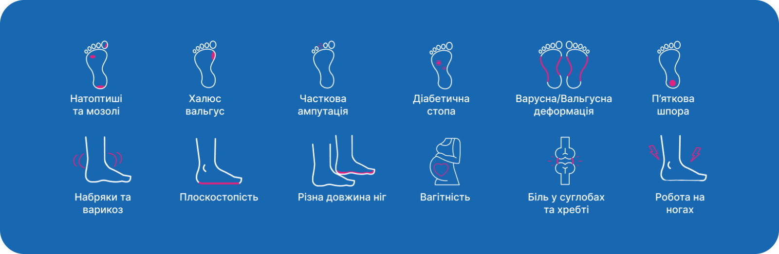 - пацієнтам із цукровим діабетом — для зменшення ризику виразок і рівномірного тиску на стопу;